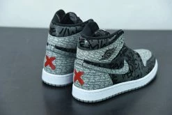 The sneaker uses the same colorway and color blocking as the Air Jordan 1 “Shadow” with a distressed leather upper and lettering printed throughout the sneaker. The Shadow portion of the sneaker features “They Can’t Stop You From Wearing Them” printed throughout and is inspired by the Air Jordan 1 commercial from 1985. Red Xs are seen on the heel similarly from the Air Jordan 1 “Banned” and a white midsole and Shadow outsole finish off the sneaker.