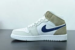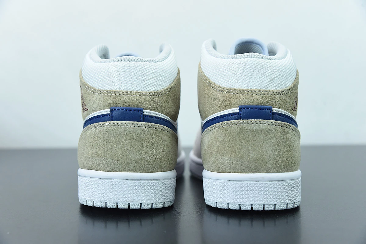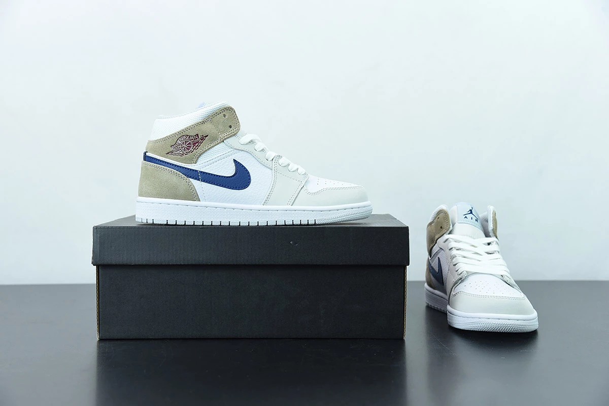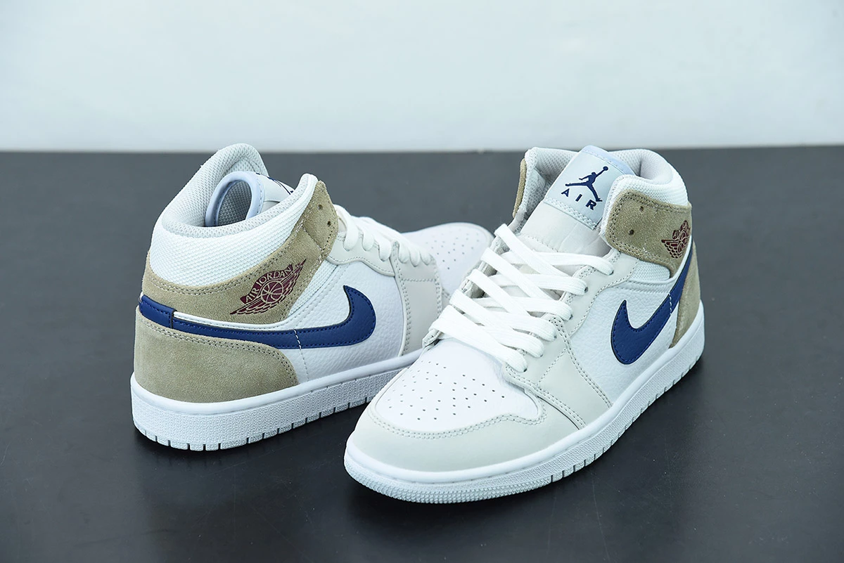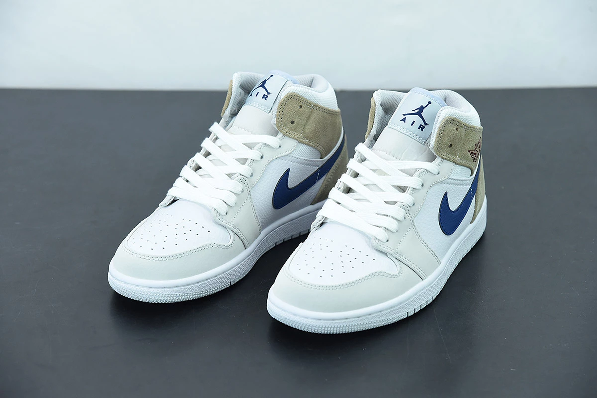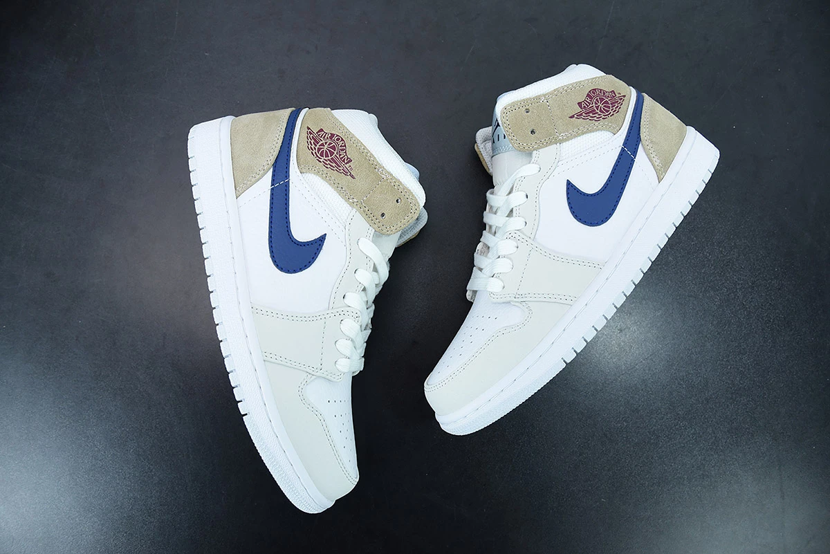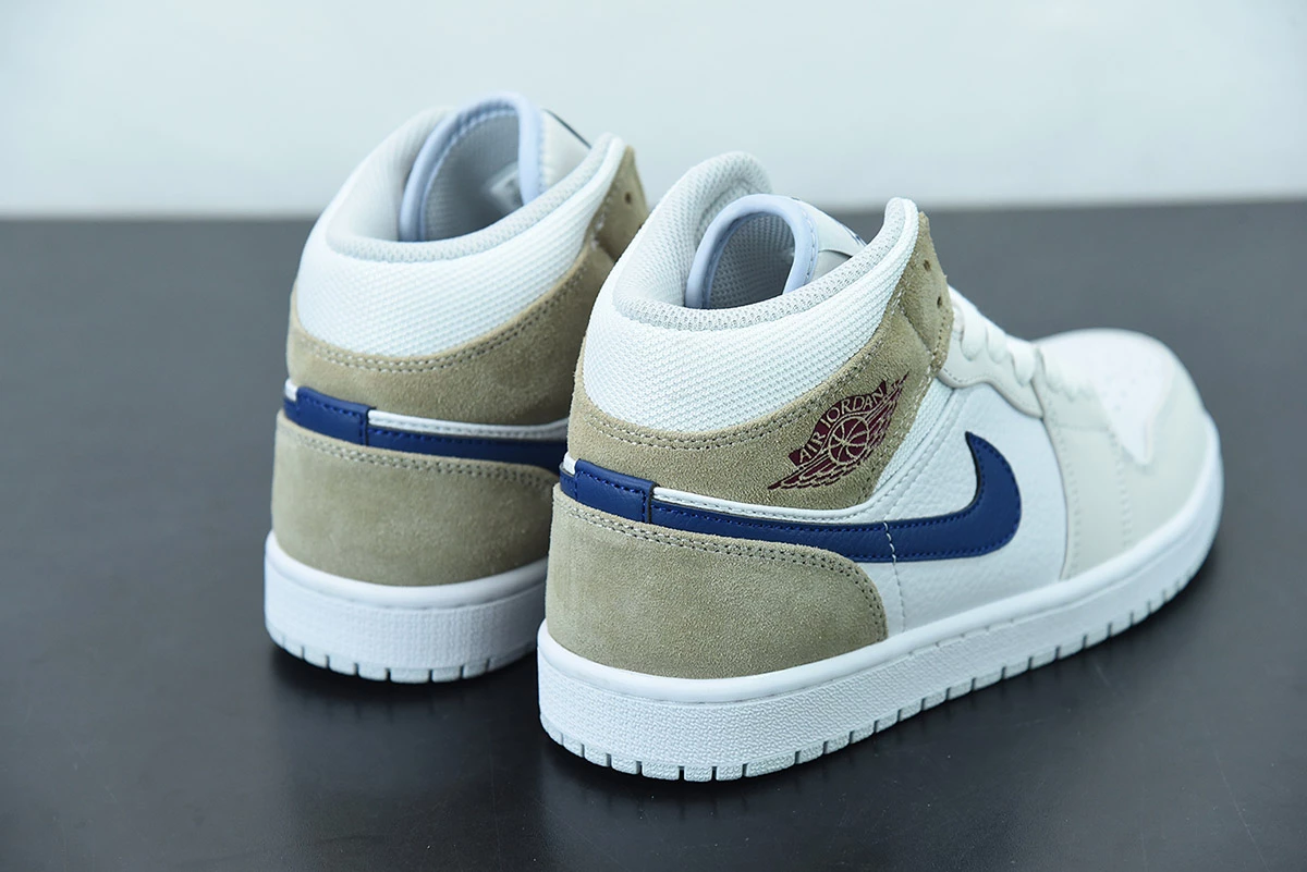 TheĀ Air Jordan 1 MidĀ uses a white leather base with sail leather overlays on the toecap and laces. The heel and ankle flap overlays use a hairy khaki suede with the Wings logo debossed in crimson red and the Swoosh is seen in navy to bring a pop of color. The Jumpman on the tongue tag uses navy as well and the midsole is seen in white with a light grey outsole.