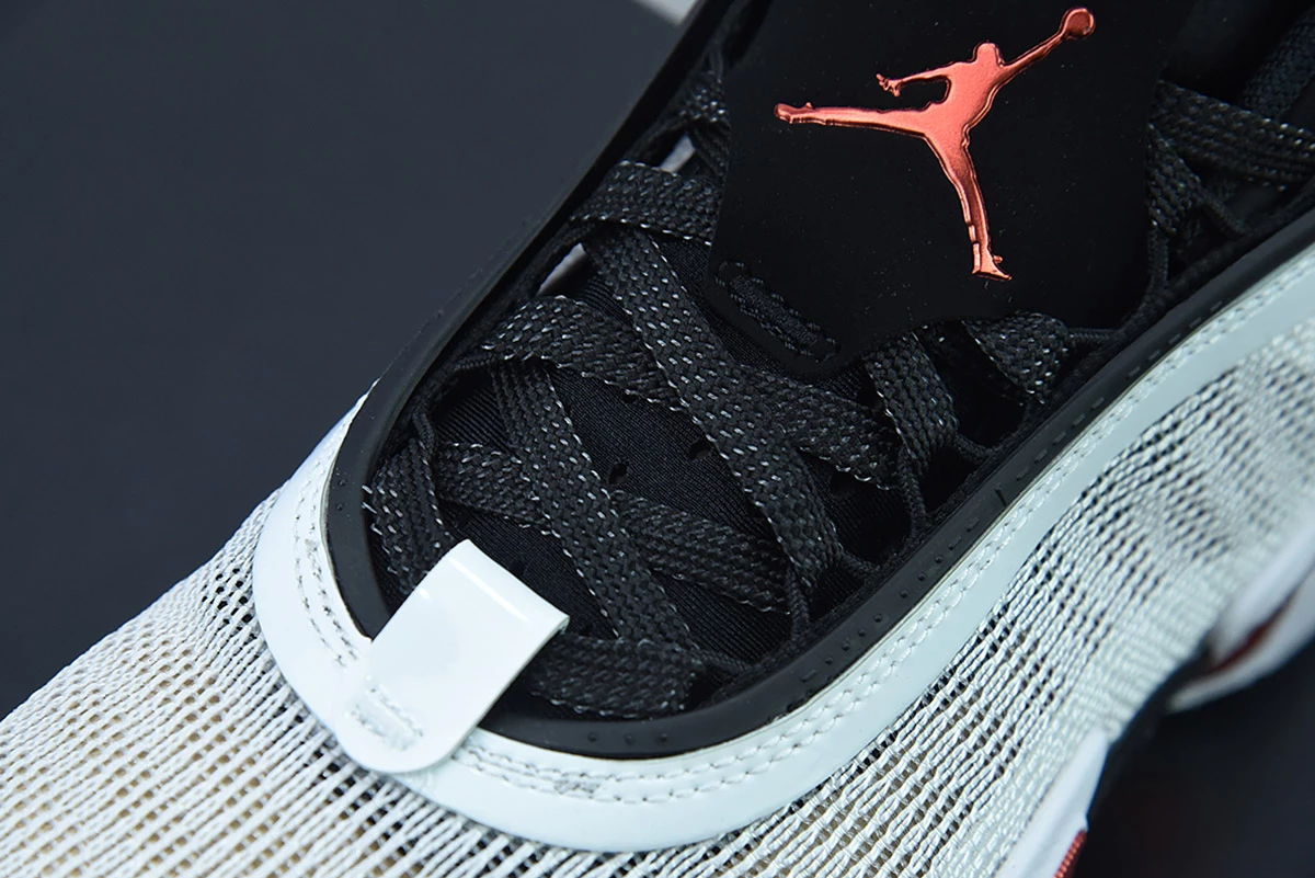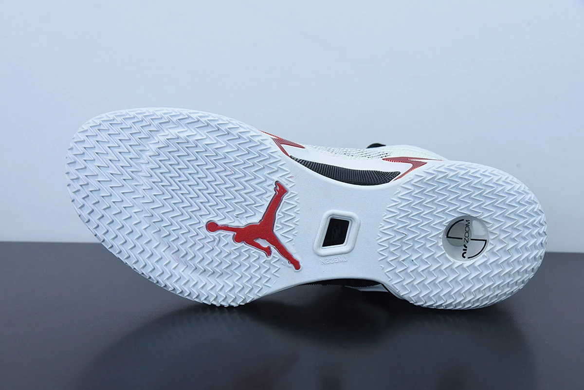 The hardwood-ready shoe starts off with a breathable Jacquard Leno-weave upper in white lined with a TPU ribbon. A subtle reptile texture runs throughout the tongue and ankle collar in a stark black hue with an enlarged tongue tab rolled onto the laces featuring the Jumpman logo in bright red. The ribbon-foam material darts throughout the white midsole housing a Zoom Air Strobel unit over an icy outsole.