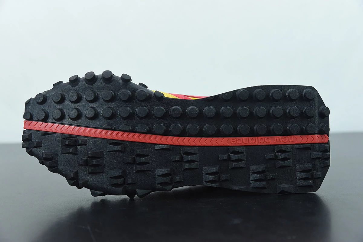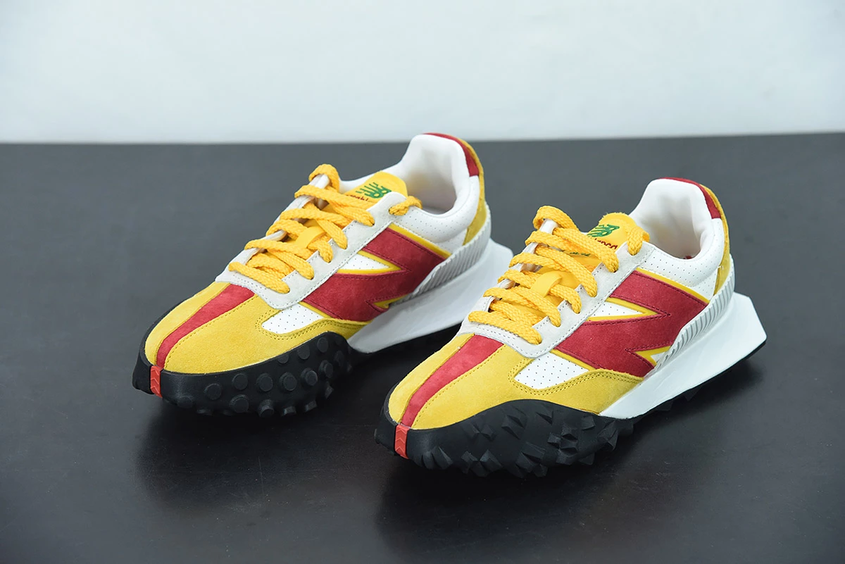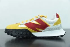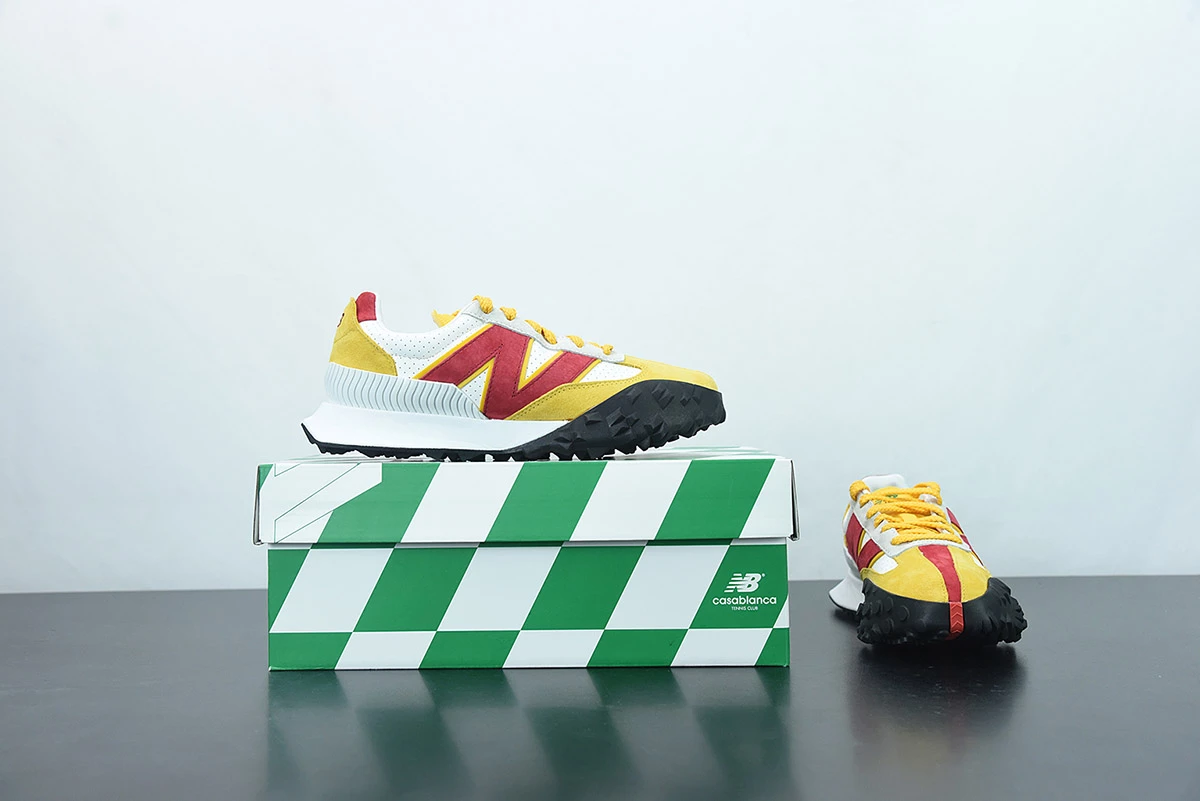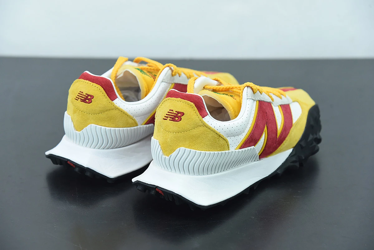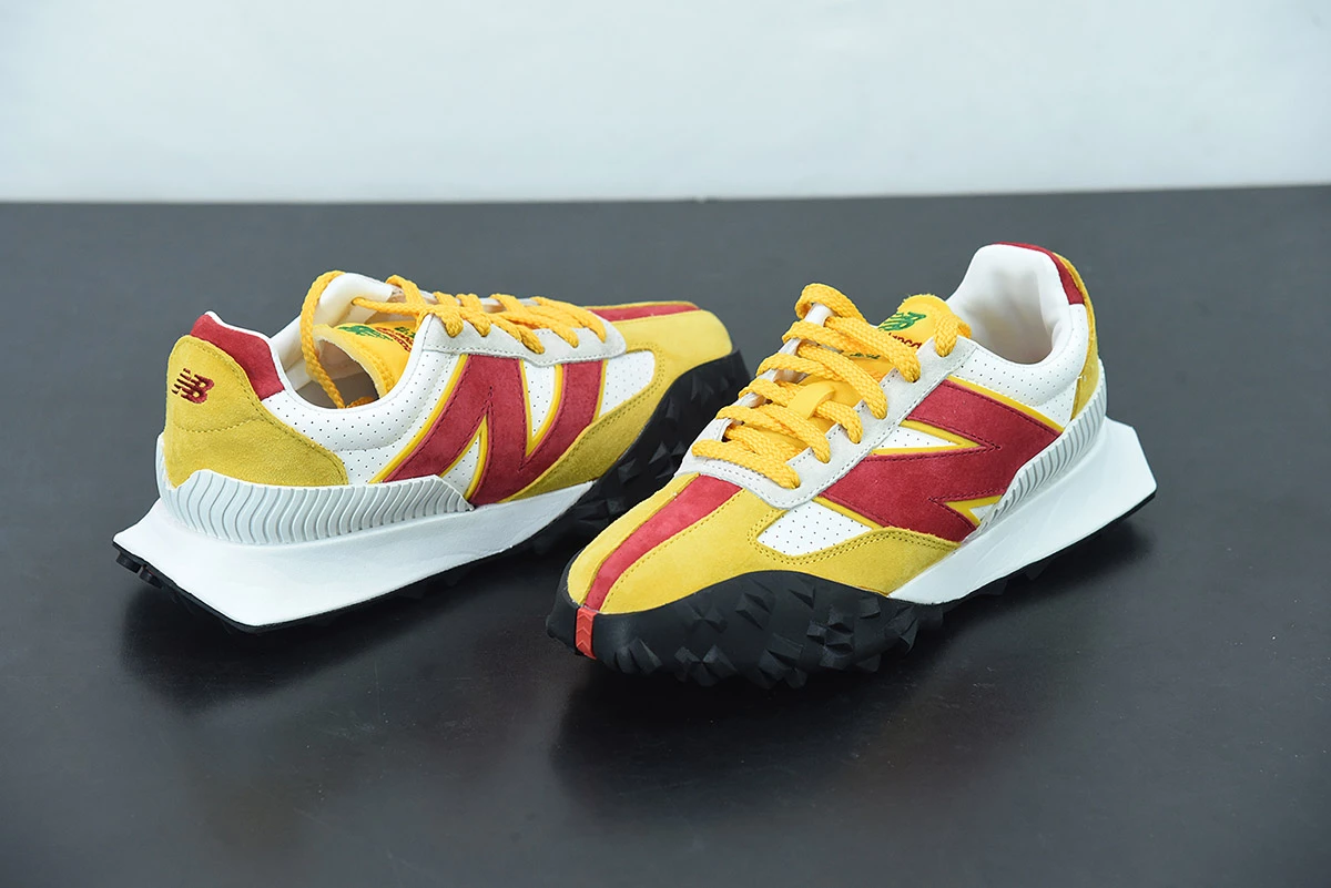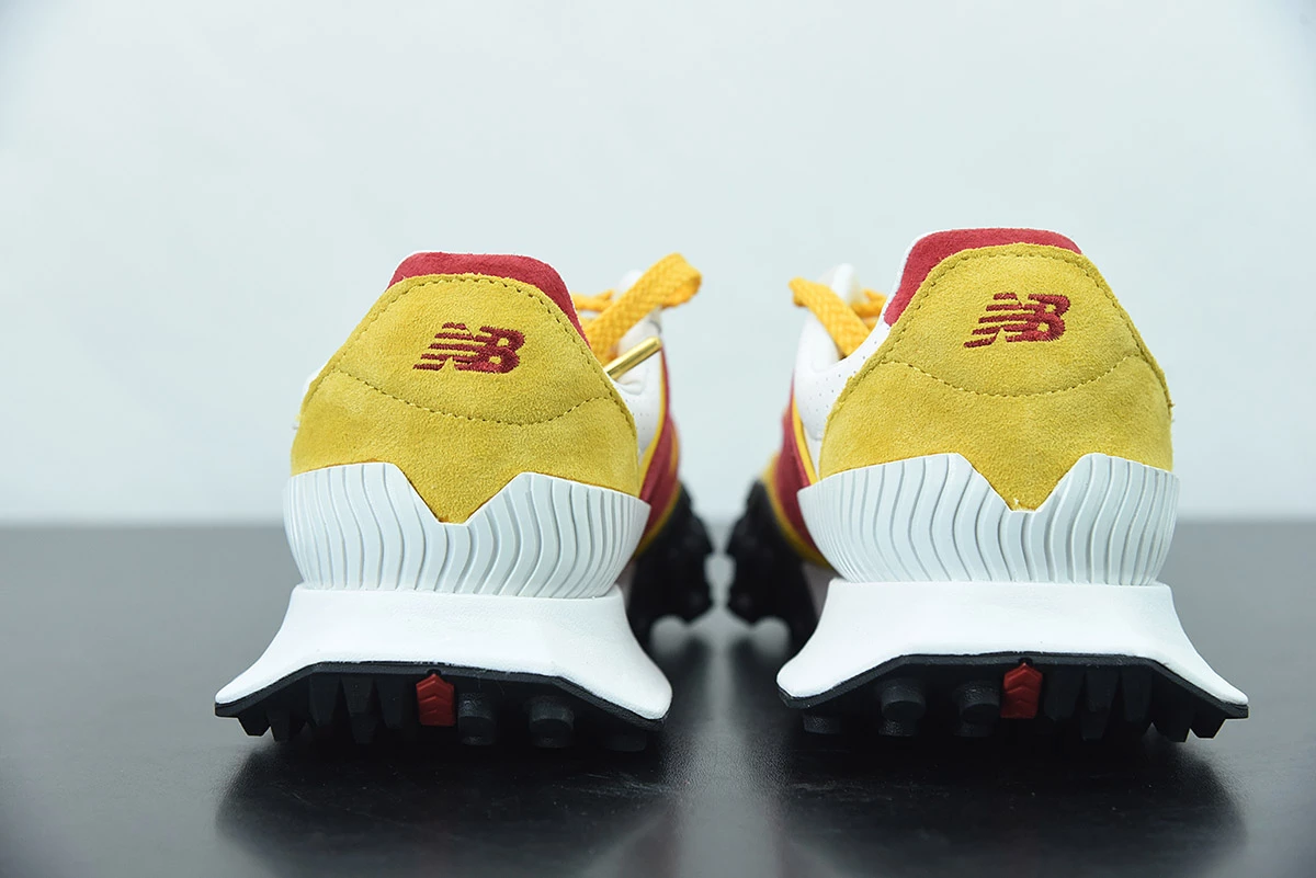 The upper comes with a crisp white leather base wrapped with suede overlays in vibrant yellow and bold red across the branding details, notably the iconic italicised N logo on the sides and NB embroidery on the heel overlays.