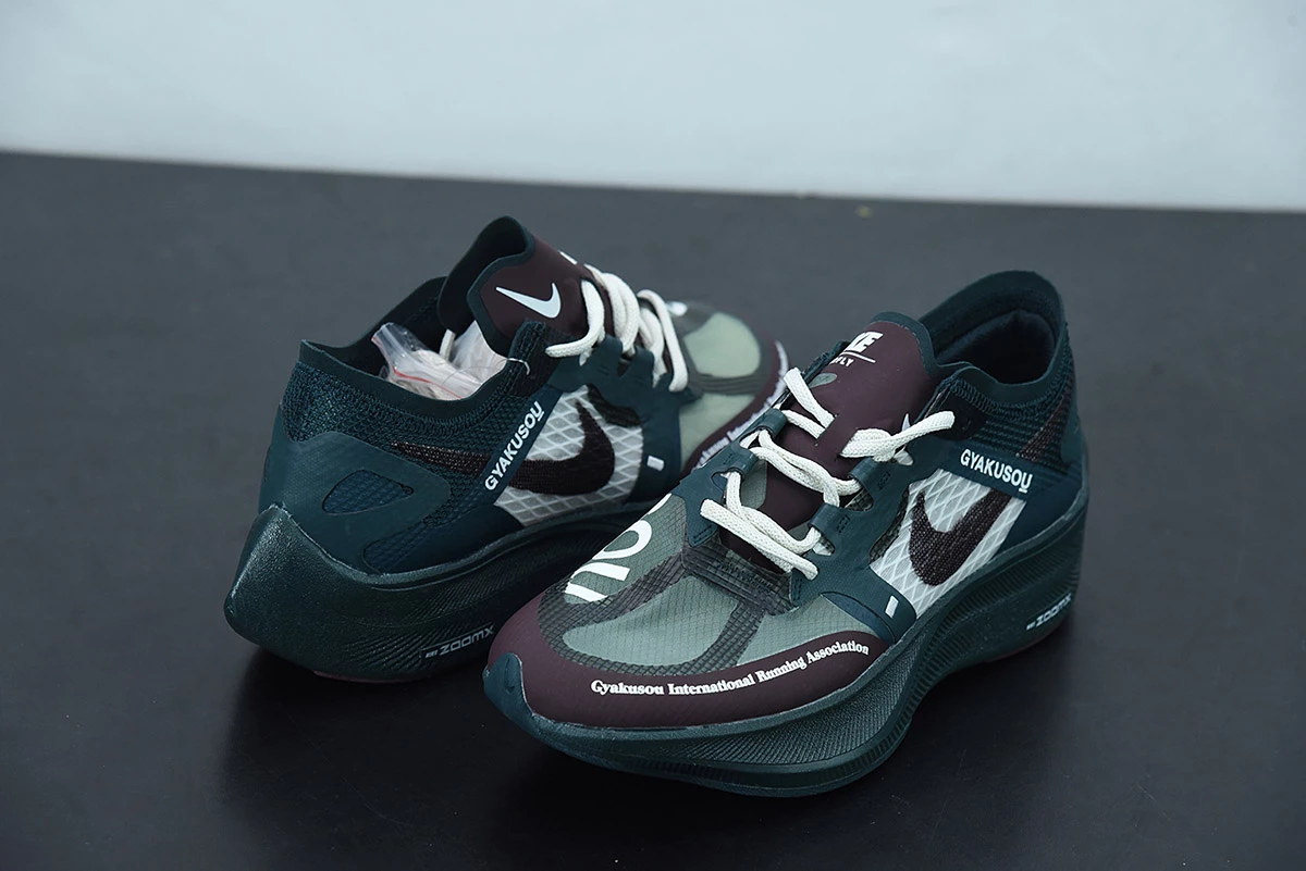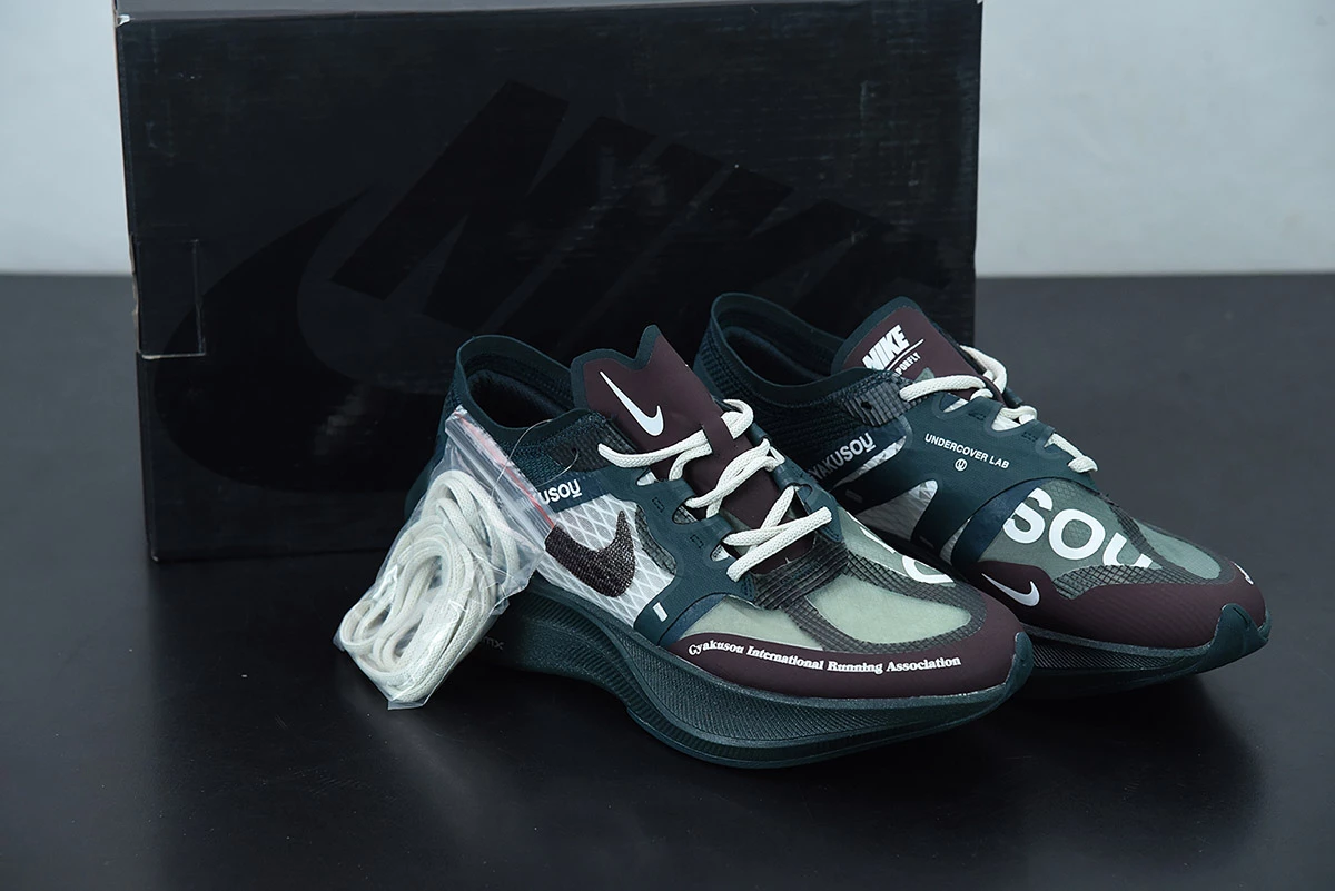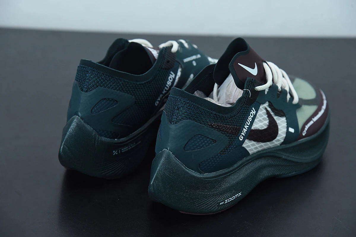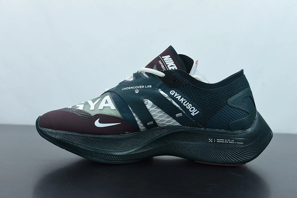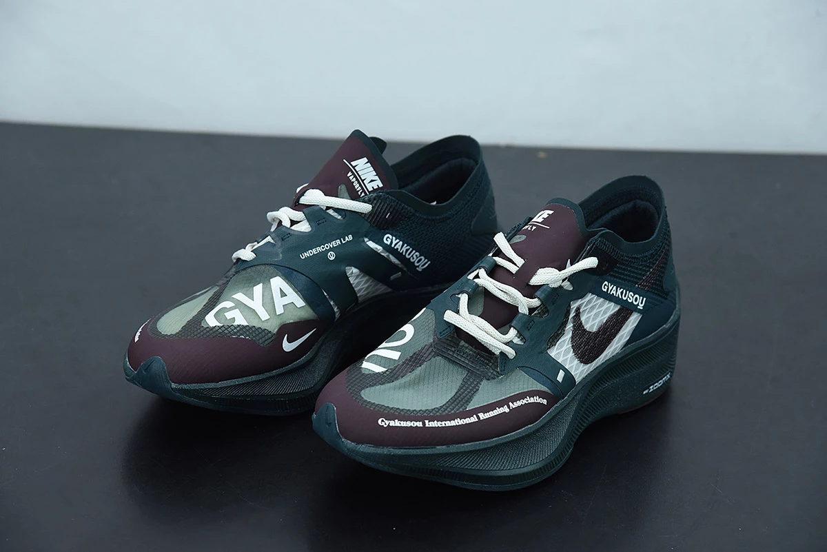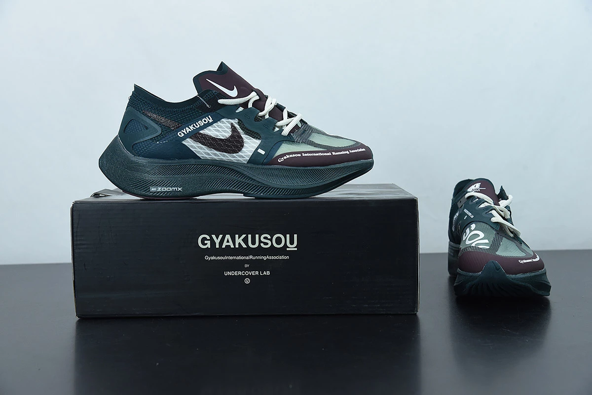 The upper is dressed in dark teal green, seafoam green, and burgundy, and in varied materials such as Flyknit, Engineered Mesh, and Fuse. Gyakusou and UNDERCOVER branding are all throughout, with a dark teal green ZoomX midsole and a full-length carbon fiber plate for energy return.