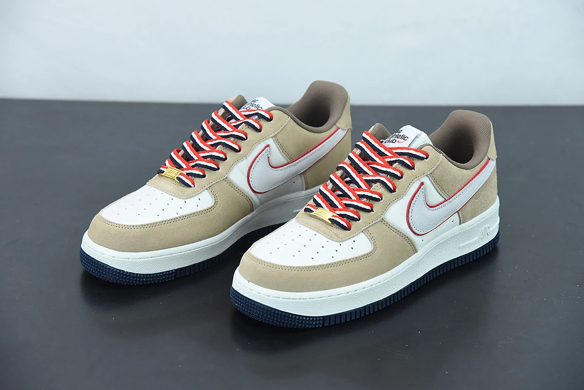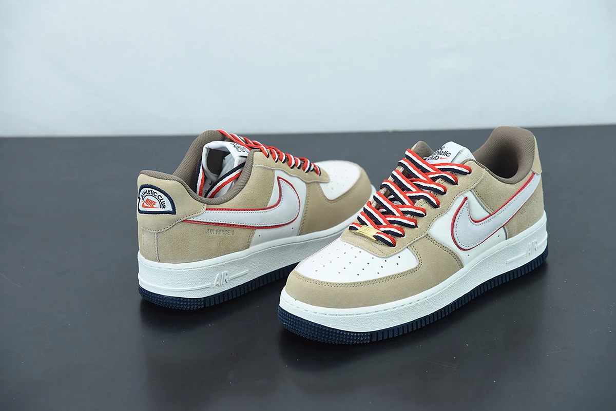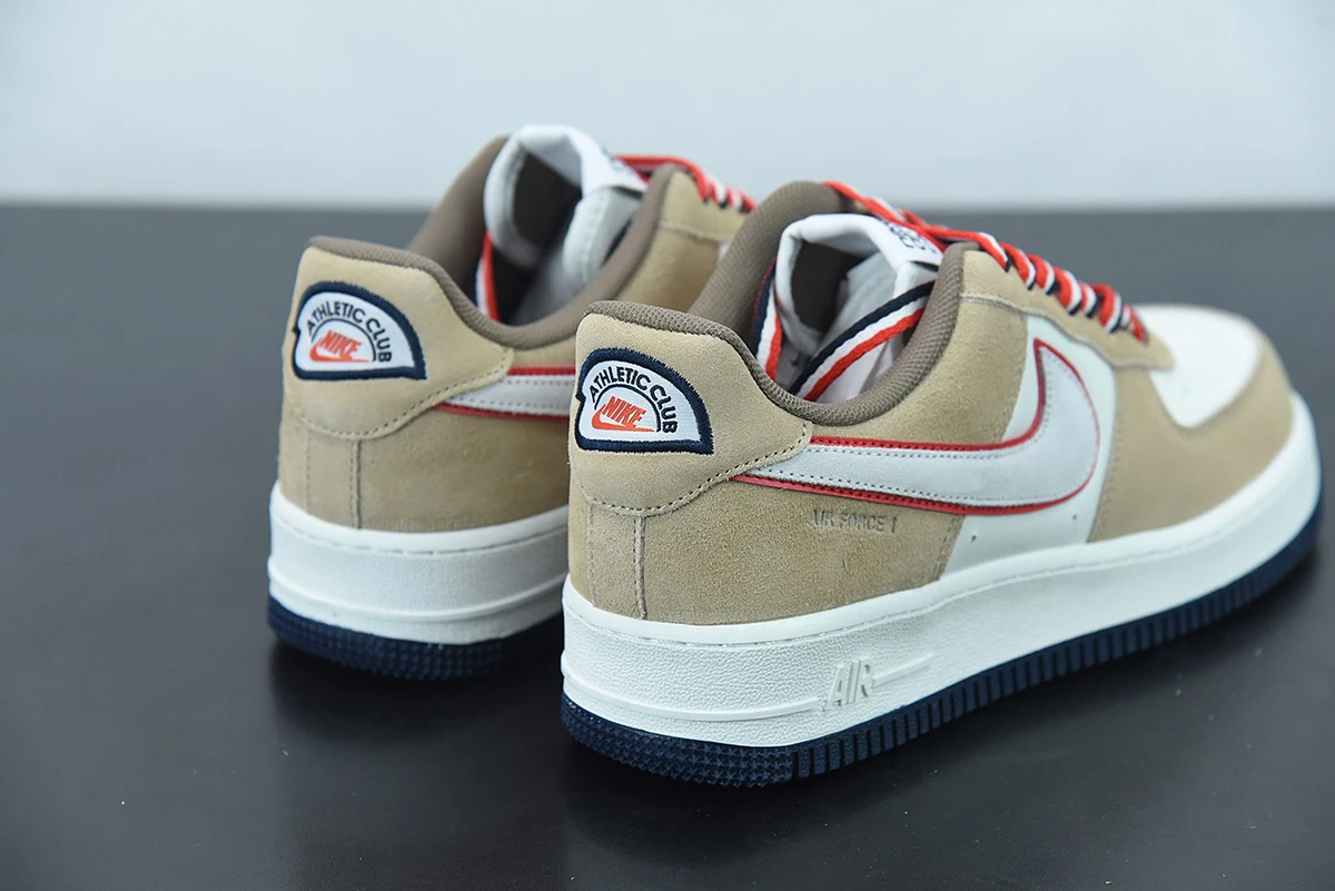 This offering of the Nike Air Force 1 Low features a Sail base with Khaki suede overlays highlighted with Orange contrasting accents atop a White midsole and Navy rubber outsole. A retro-inspired Nike Athletic Club tongue tags and insoles with a special sew-on patch on the heels completes the design.