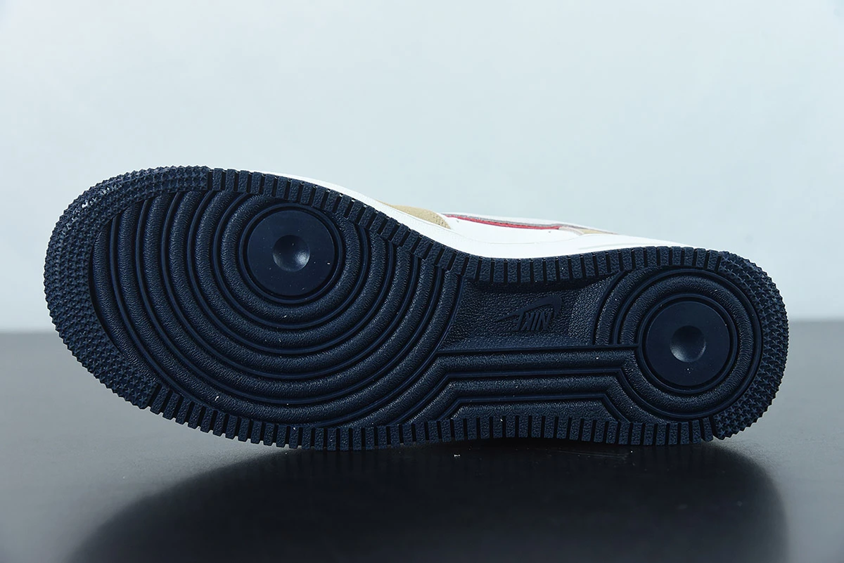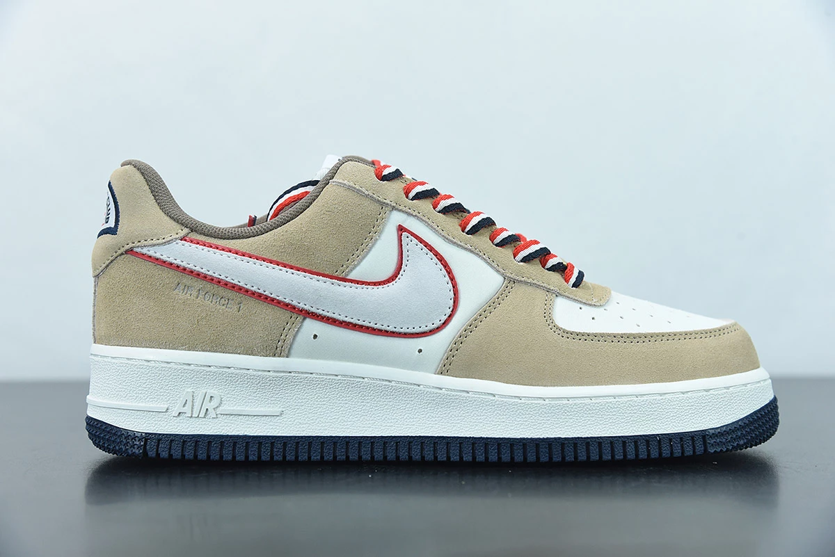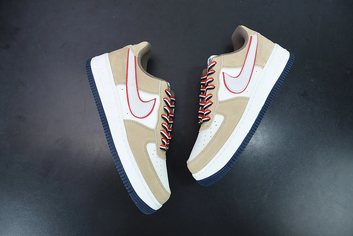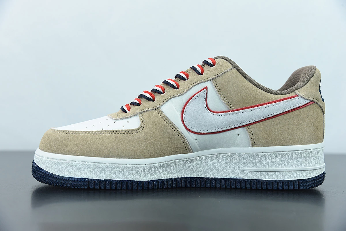 This offering of the Nike Air Force 1 Low features a Sail base with Khaki suede overlays highlighted with Orange contrasting accents atop a White midsole and Navy rubber outsole. A retro-inspired Nike Athletic Club tongue tags and insoles with a special sew-on patch on the heels completes the design.