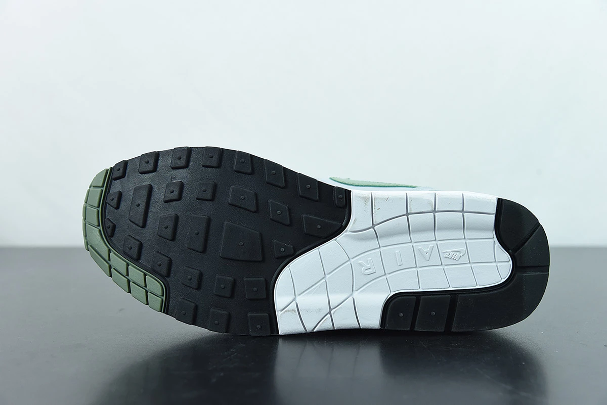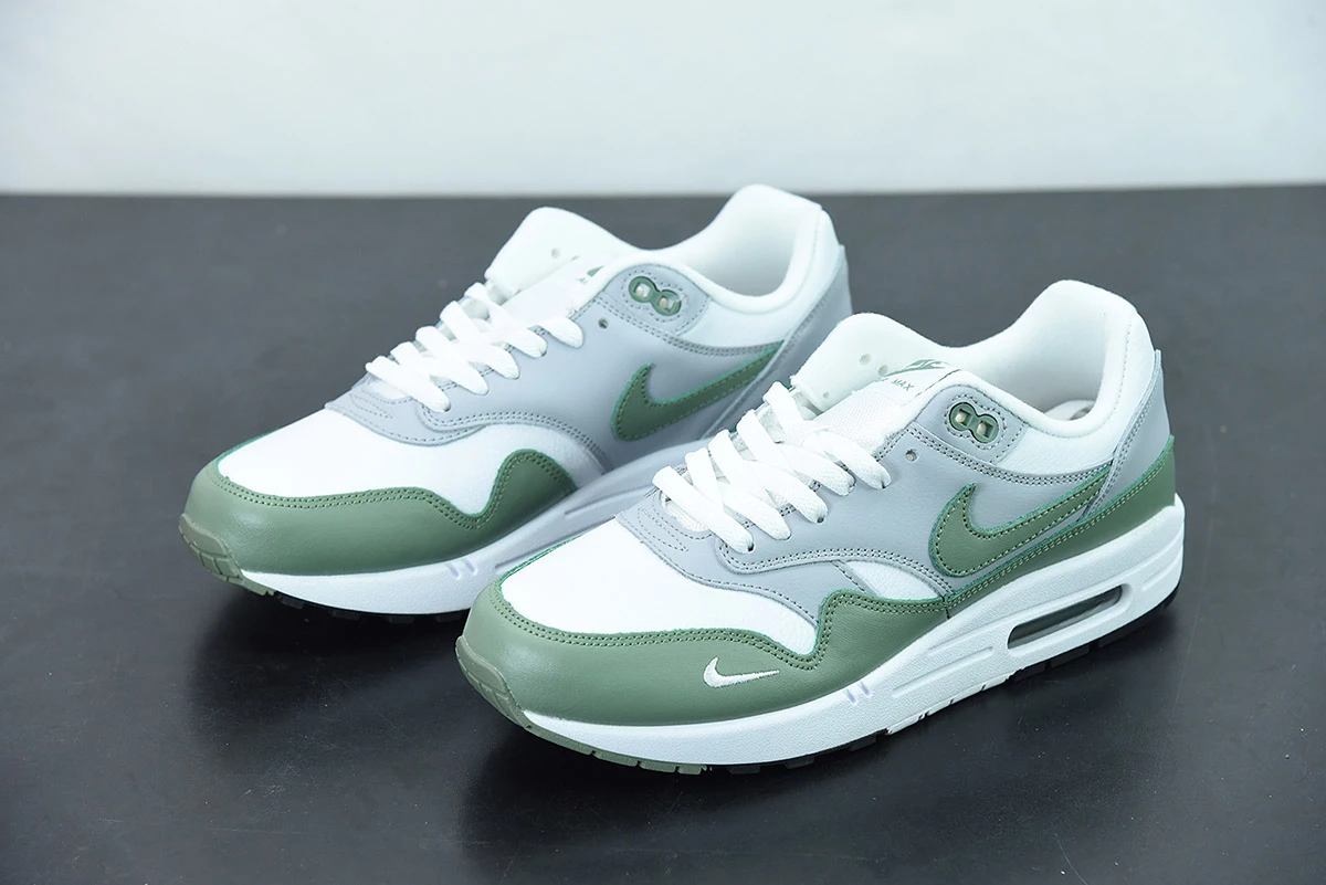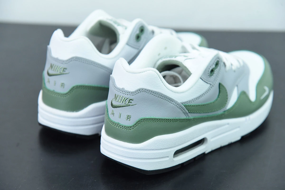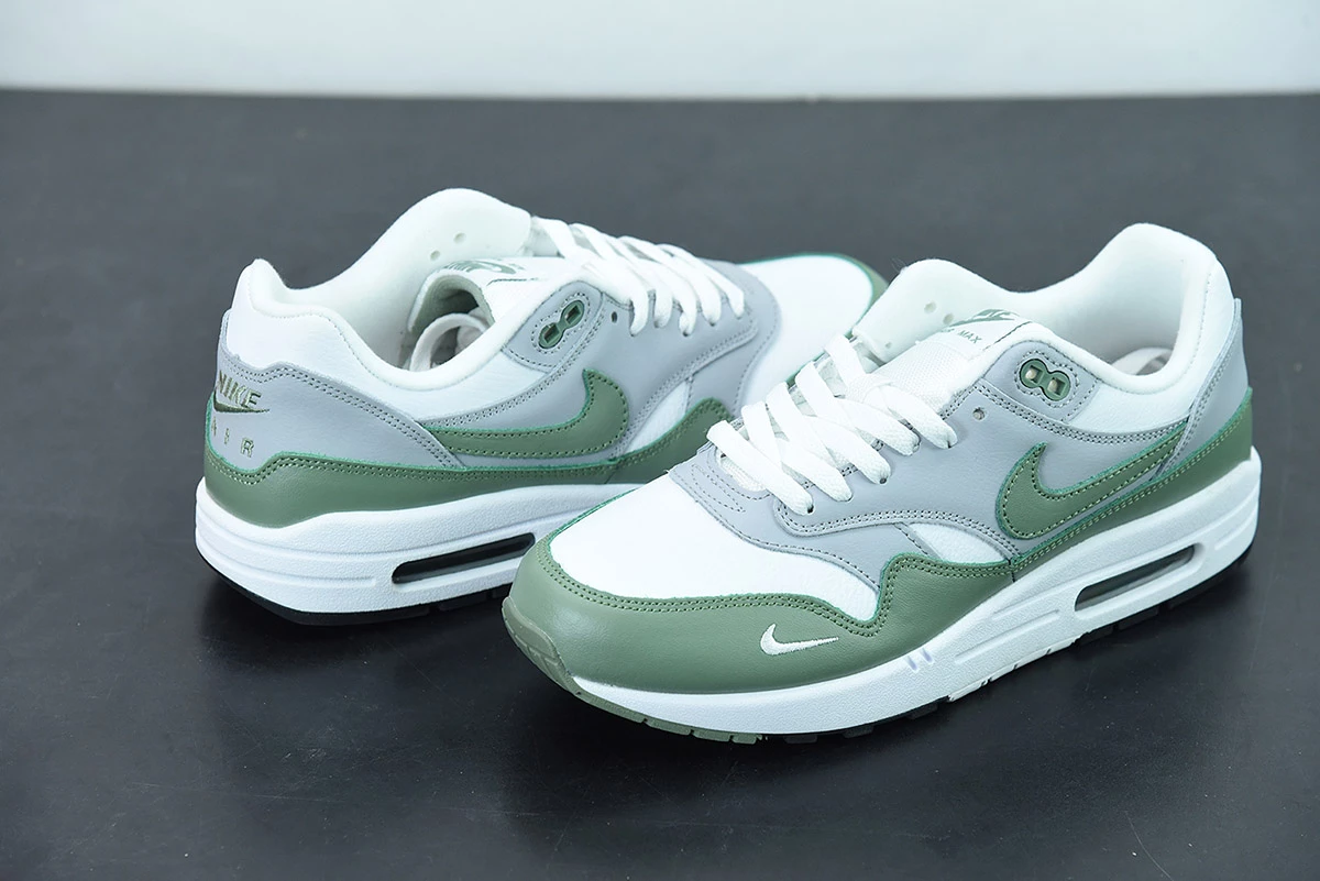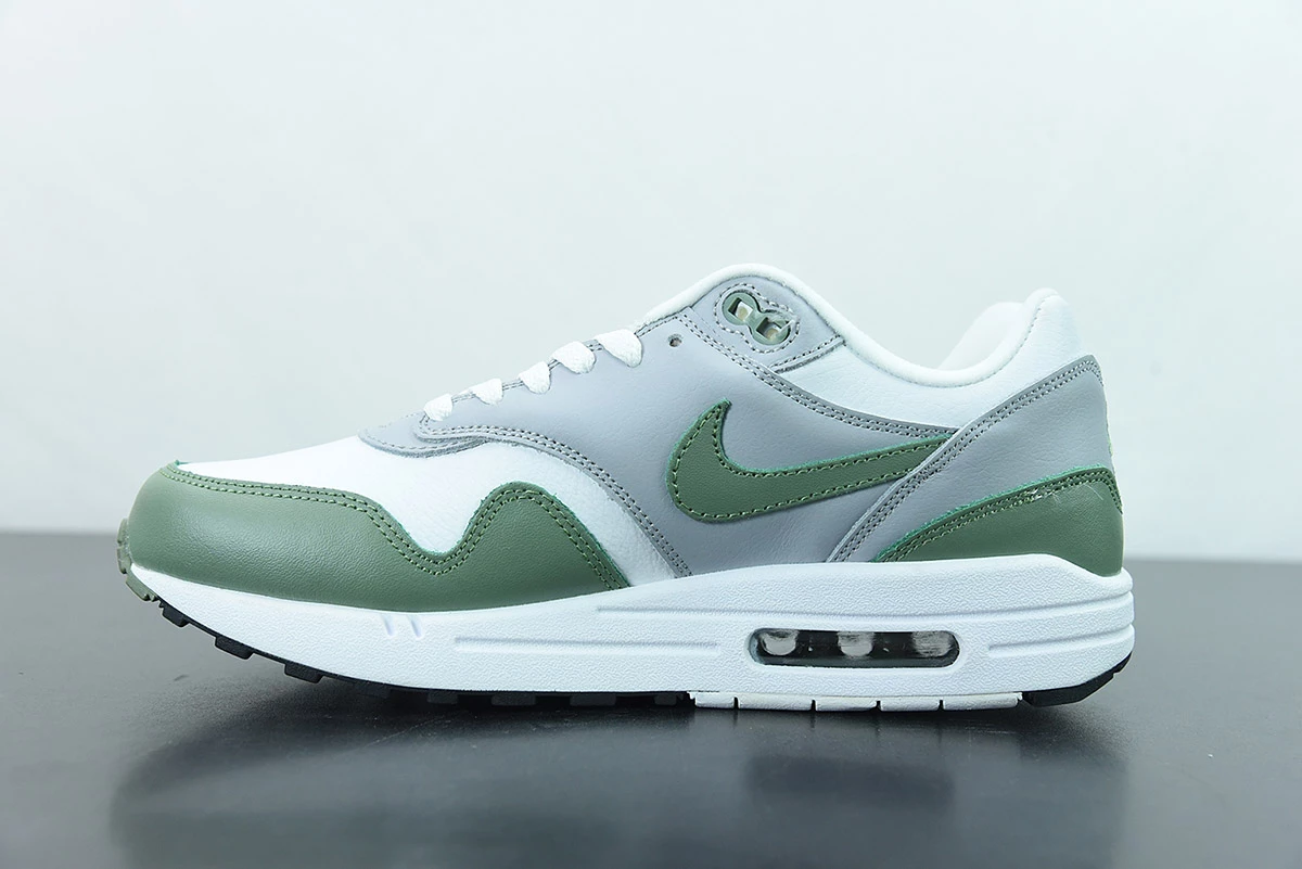 Dressed in a White, Spiral Sage, Wolf Grey, and Black color scheme. This Nike Air Max 1 features a White leather base with Grey overlays on the forefoot and heels. Highlighting the shoe are Sage Green mudguards, Swoosh, tongue and heel branding completed with a White midsole and tri-colored rubber outsole.