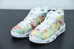 Out of the three, the UK version is the boldest pair. Dressed in a Amarillo, Speed Red, Neptune Green, and White color scheme. This Nike Uptempo features a colorful blotchy graphic throughout its upper contrasted with White detailing. A solid White midsole and rubber outsole with a Red Swoosh and the countries state logo on the heels completes the design.