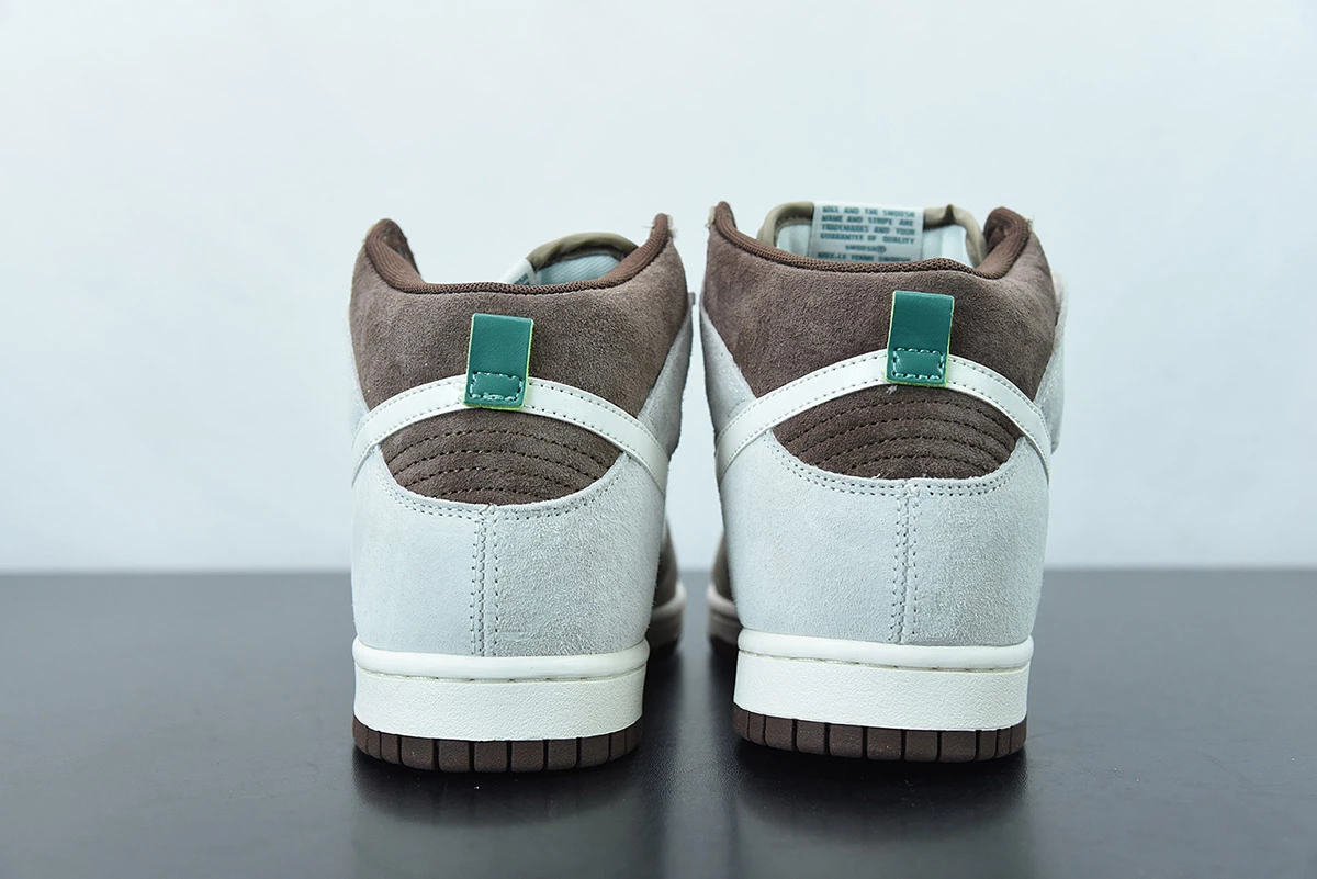 Dressed in a Sail, Khaki, and Light Chocolate color scheme. This Nike Dunk High comes constructed in a mix of suede and leather in a mix of Sail and Brown hues. Pops of Green on the tongue and heel tab adds to the outdoor vibe completed with a Sail midsole and Chocolate Brown rubber outsoles.