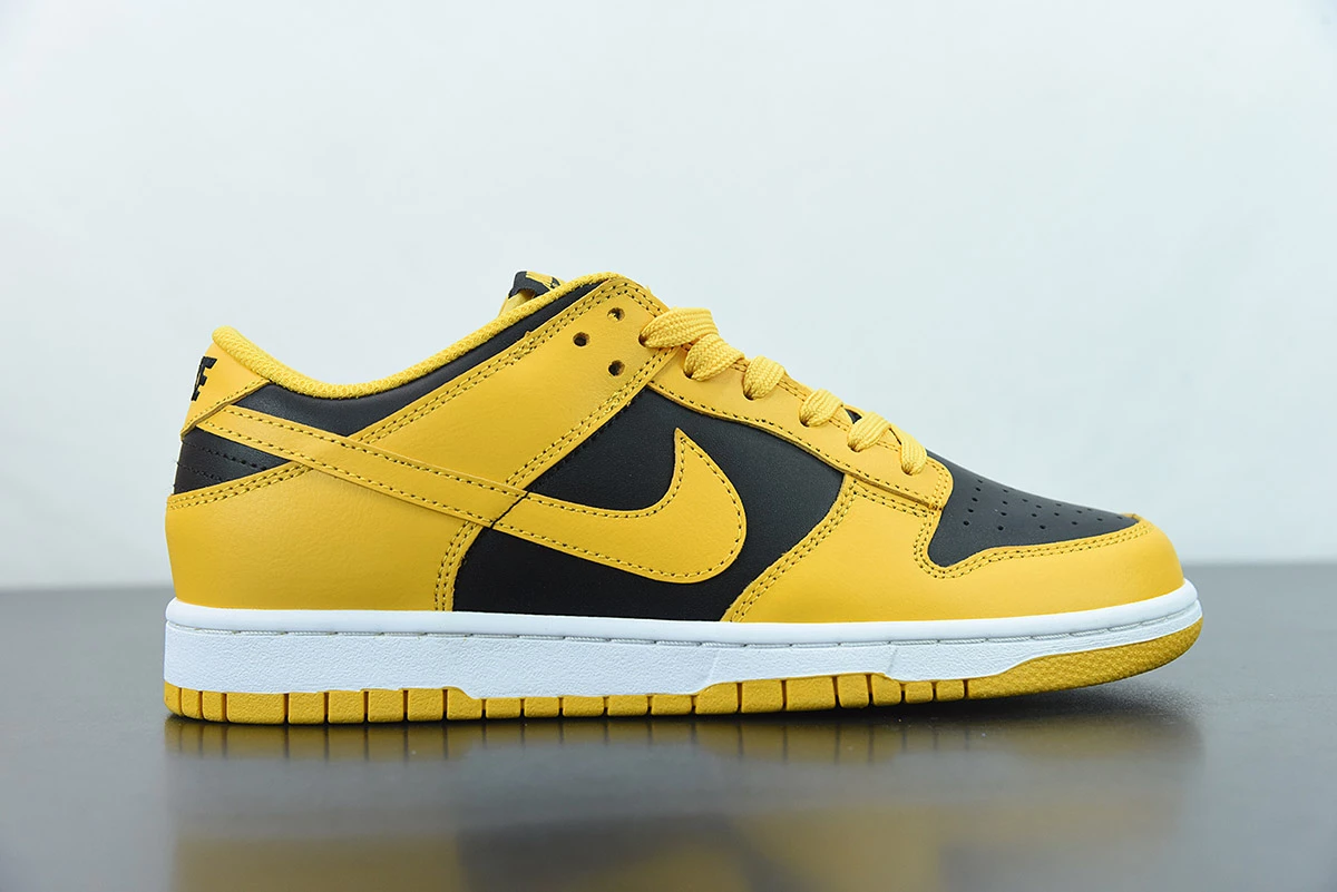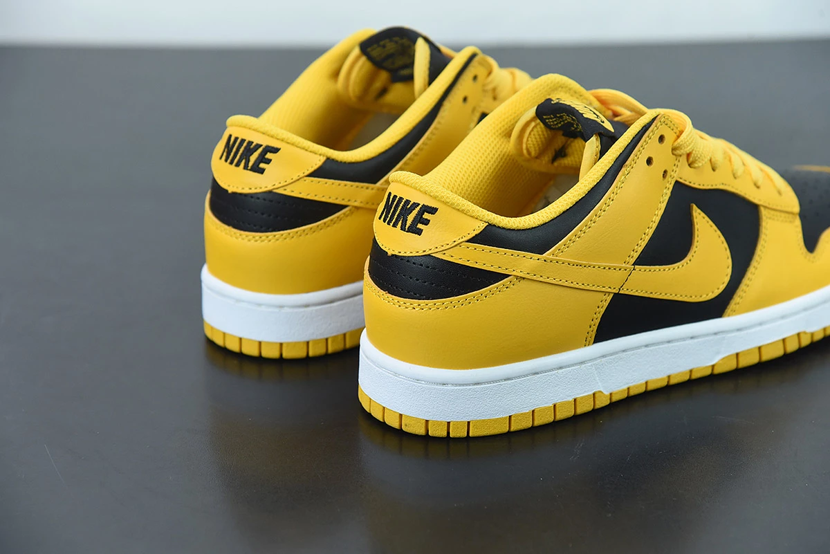 Dressed in a Black, Goldenrod, and White color scheme. This Nike Dunk Low comes constructed in a full leather build featuring a Black base with Golden-Yellow overlays, Swooshes, branded tongues and rubber outsole. Black “NIKE” embroidery in the rear atop a White midsole with Orange branding on the insoles completes the design.
