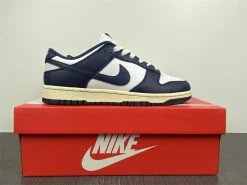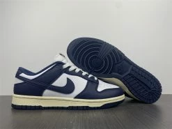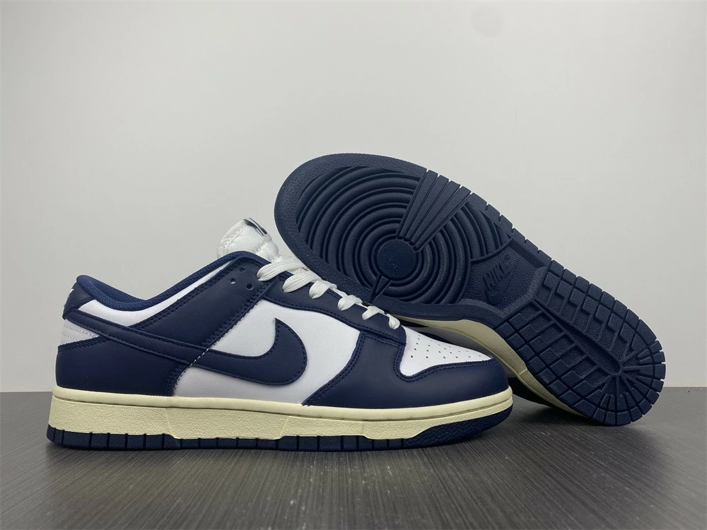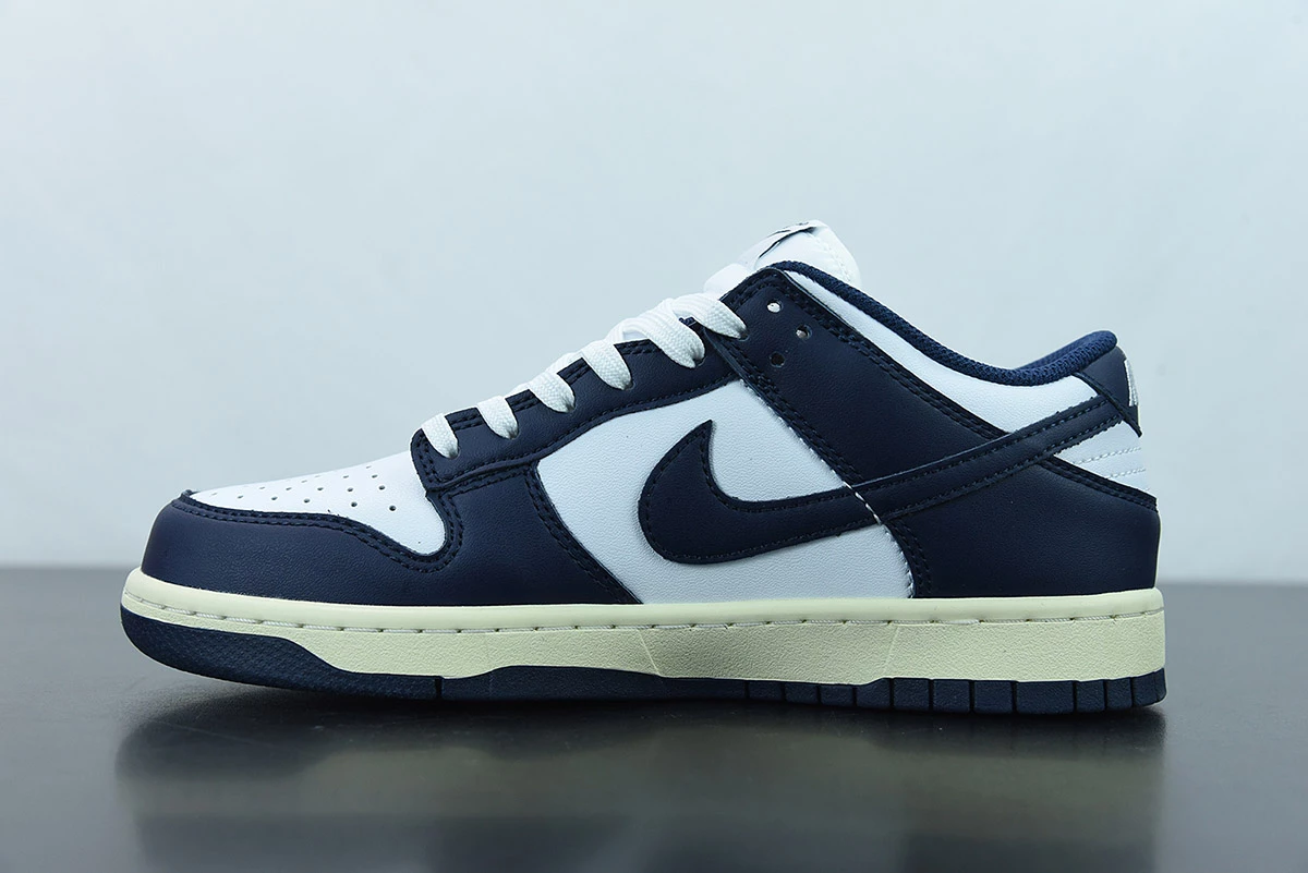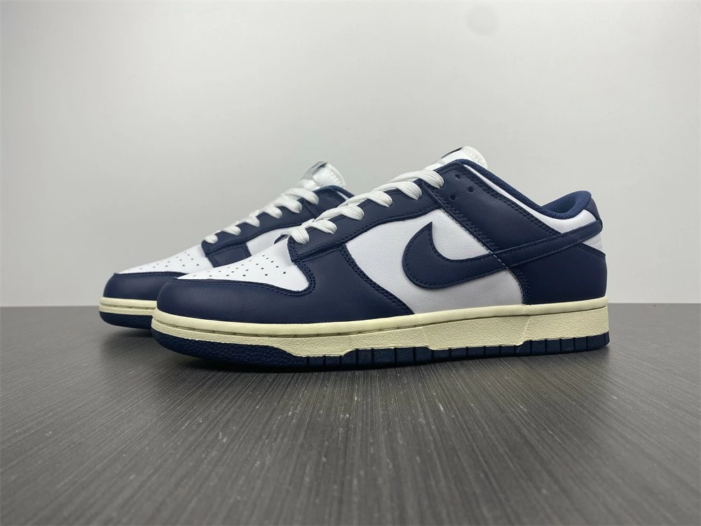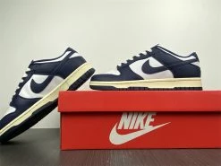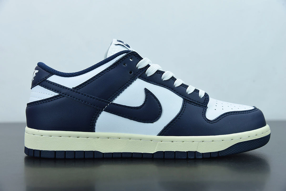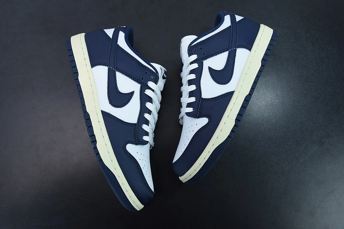 This aged-offering of the Nike Dunk Low keeps things simple and traditional featuring a White leather base with matching nylon tongues, laces, and heel branding. Navy leather overlays, Swooshes, lining, outsole, and tongue branding while the vintage aesthetic continues with Off-White laces, Cream Nike branding on the insoles atop a Yellowed midsole.