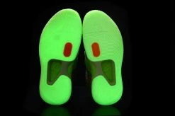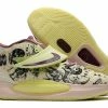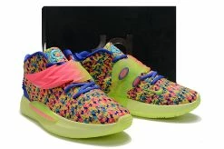 The sneaker uses different graphics laid over each other for multi-dimensional depth alongside the textured shearling used for durability on-court. The KD 14 usually uses a Nike Presto-inspired midfoot strap but English put his spin on it with a lightbulb on the medial side that transitions to a textured wing, similarly seen on previous Aunt Pearl KD sneakers. The Cushlon midsole comes in a bright green with the lateral TPU stabilizer seen in bright green and pink and a full-length Zoom Strobel unit is utilized for impact protection and responsiveness.